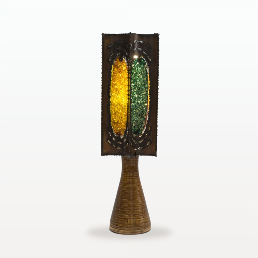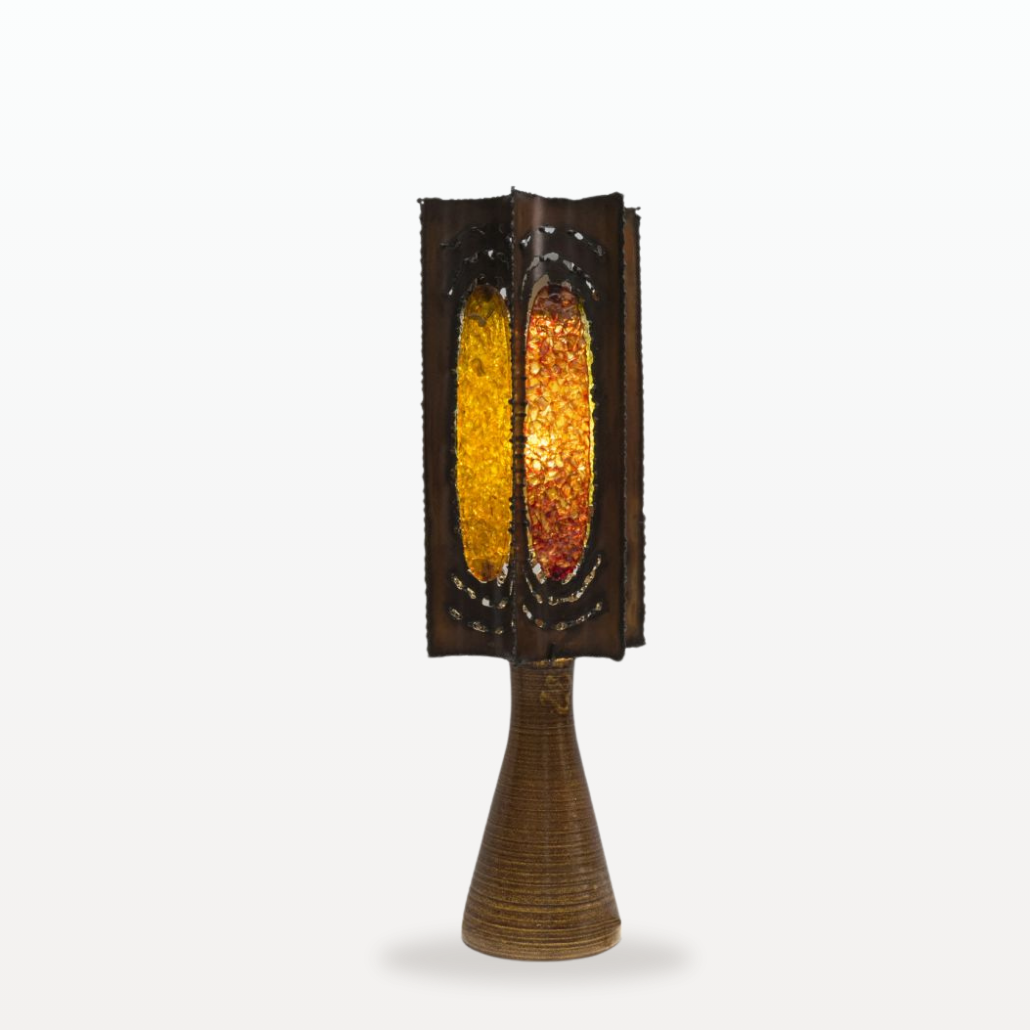 Ni tout à fait lampe, ni tout à fait œuvre d’art : cette création signées par la manufacture d’Accolay fait danser la lumière comme un rayon de soleil sur les années 70.