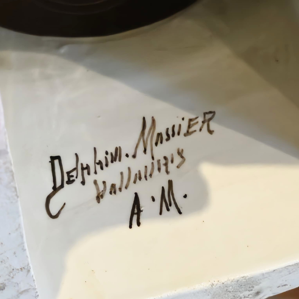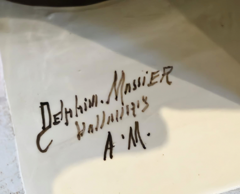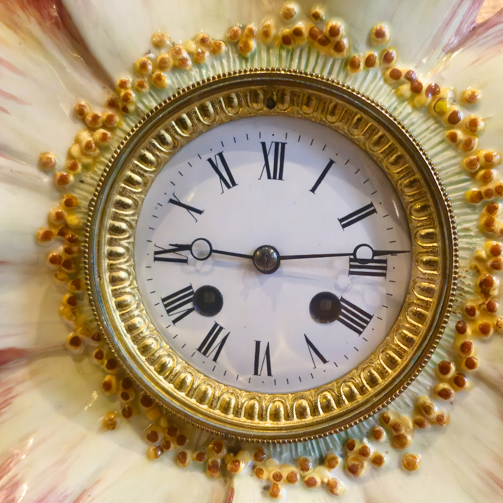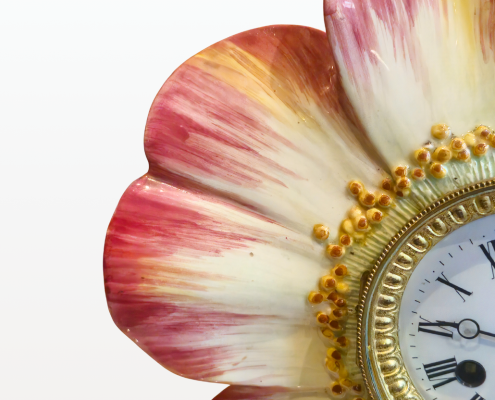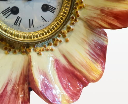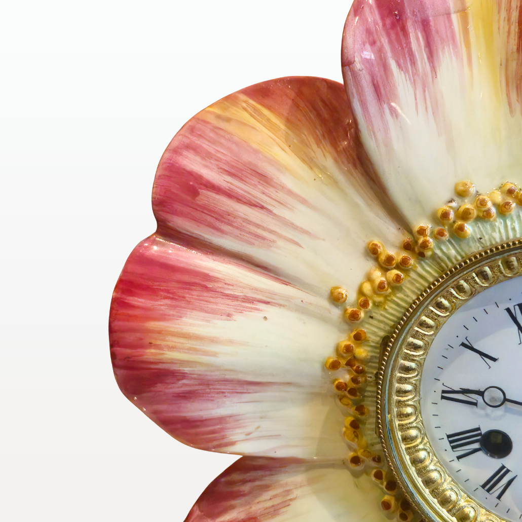 Cette pendule en forme de fleur est signée Delphin Massier. Ses couleurs délicates se marient parfaitement avec la finesse du mouvement.