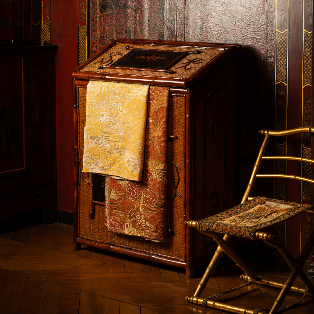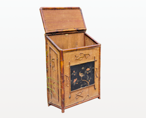 Ce coffre de rangement pour soierie et tissu de jardin d’Hiver provient de la célèbre manufacture française Perret et Vibert. Le bambou et le motif de la laque lui donnent un style asiatique témoignant de l’attrait des artistes pour les arts orientaux.