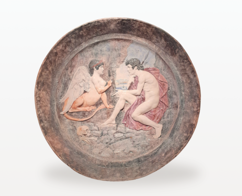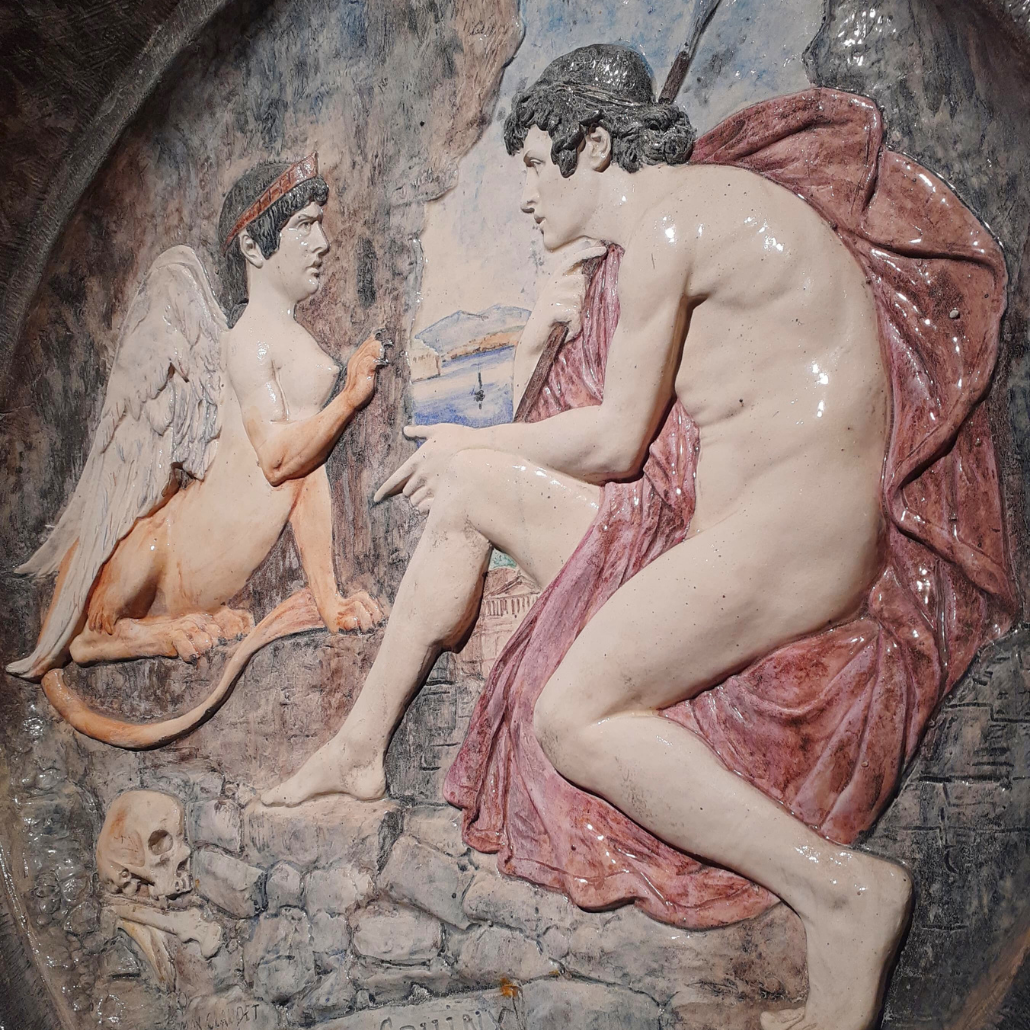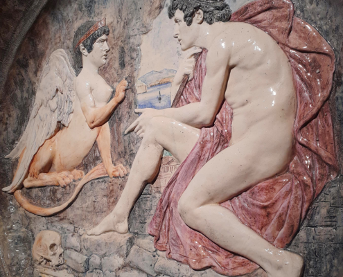 Les deux personnages aux corps d’une blancheur immaculée contrastent au sein de cet environnement karstique creusé dans une roche grise. On reconnait Œdipe à son peplum rouge pourpre et sa lance face au Sphinx ailé et couronné.