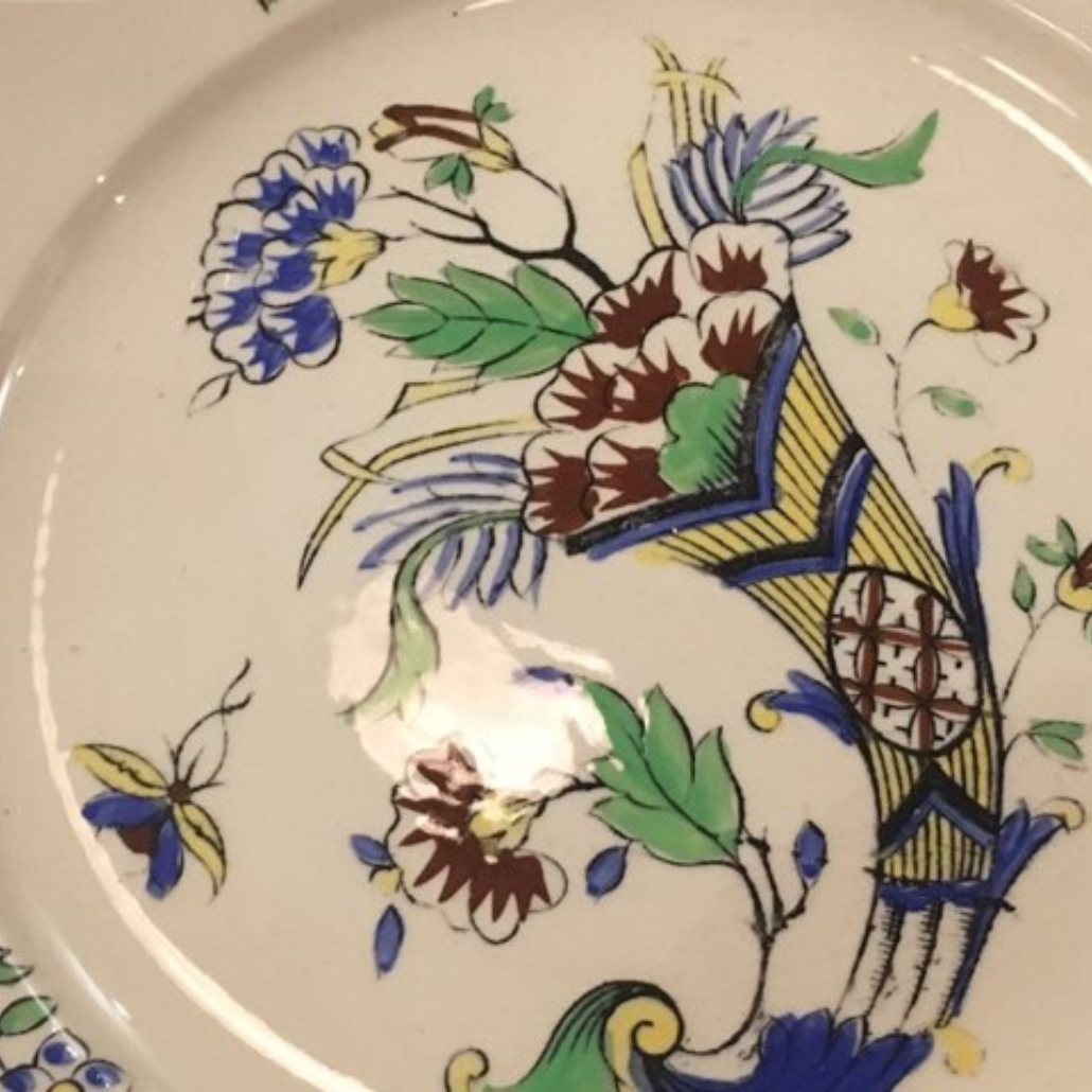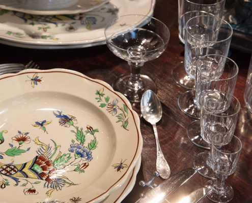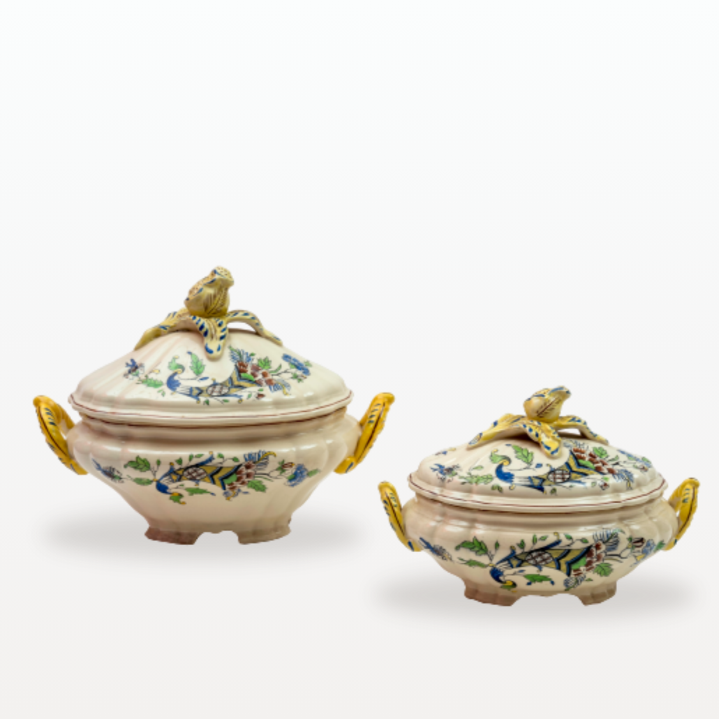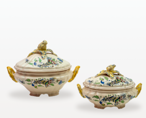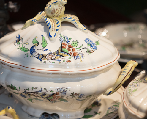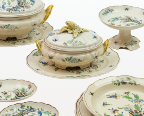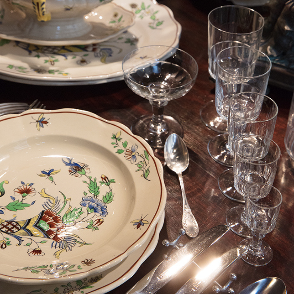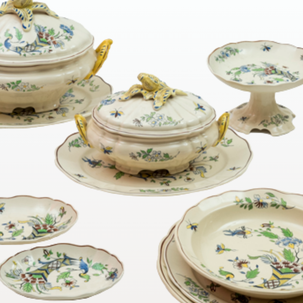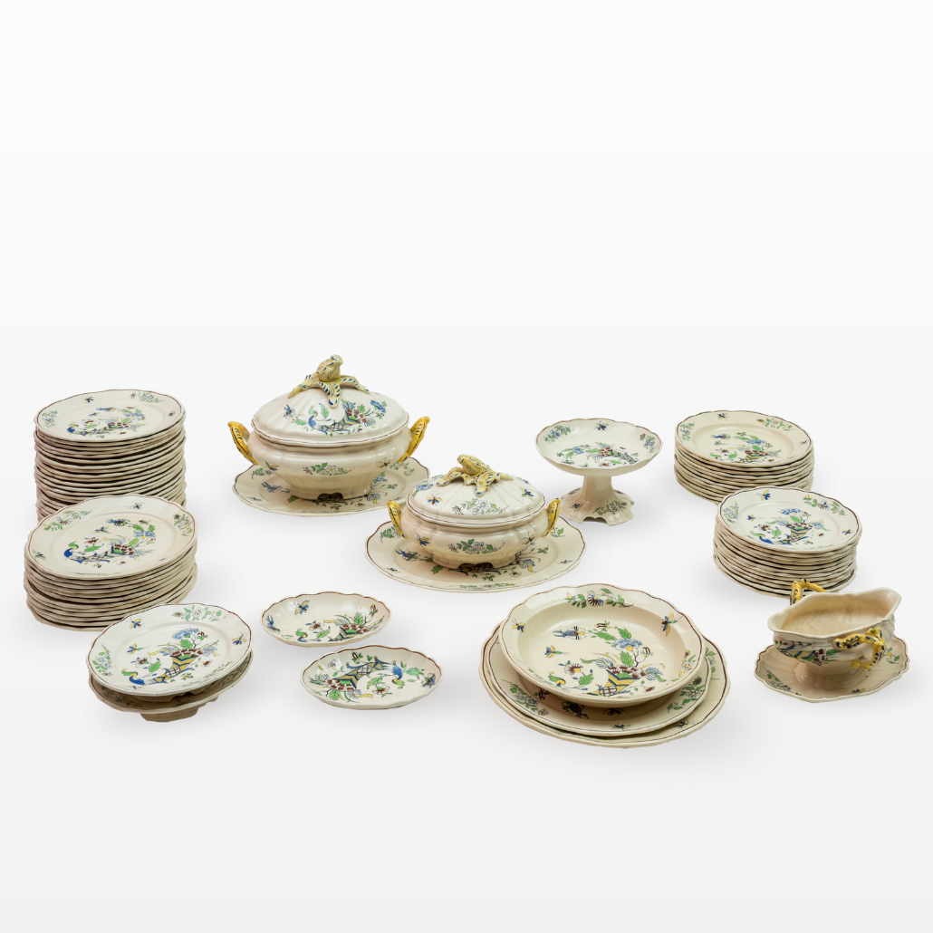6 raviers, 2 saucières, 2 grandes soupières avec couvercle, 1 petite soupière avec couvercle, 2 coupes hautes sur pied, 4 plats rond creux, 4 coupes sur petit pied, 1 plat ovale, 1 plat rond plat grand modèle, 1 plat rond plat petit modèle, 2 légumiers grand modèle sans couvercle, 1 légumier petit modèle sans couvercle.
